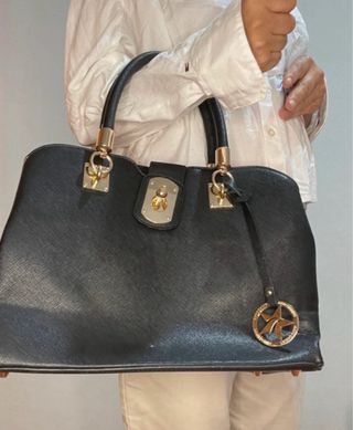 Precioso bolso de mano en color negro. Está hecho de piel y tiene una correa bandolera y otra corta. Es ideal para llevarlo al trabajo o a una salida nocturna. - Piel auténtica. - Asa de mano y asa bandolera. - Diseño elegante y sofisticado. - Perfecto estado.