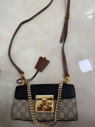Bolso de mano y hombro de la marca Gucci. - Combinación de colores beige y negro. - Detalle de cadena dorada. - Cierre de solapa con broche. - Incluye etiqueta de cuero. -Nuveo.