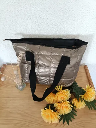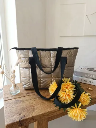 Bolso tote acolchado con un diseño moderno y espacioso. - Acabado metalizado brillante. - Asas de tela resistentes. - Cierre de cremallera superior.