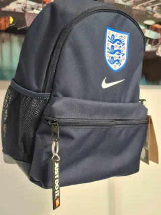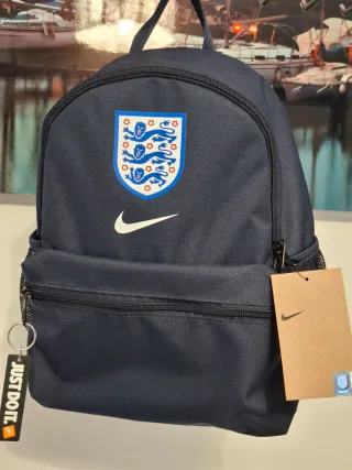 Mochila azul con el escudo de Inglaterra y el logo de Nike. - Cierre de cremallera. - Bolsillo frontal con cremallera. - Llavero Just Do It.