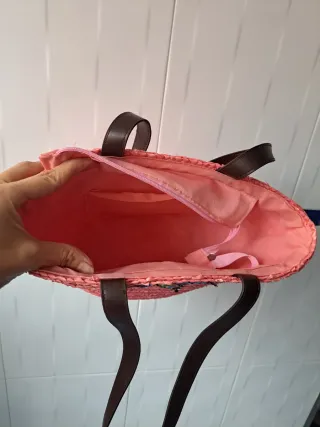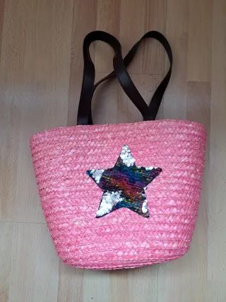 Bolso de playa de rafia en color rosa, perfecto para las niñas. Presenta un diseño divertido con una estrella decorada con lentejuelas. No se ha usado nunca - Material: Rafia - Adorno: Estrella de lentejuelas multicolor o plateadas segun como las quieras poner