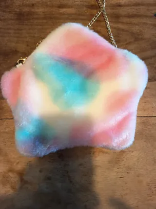 Bolso de peluche con forma de estrella, ideal para niñas. Su diseño divertido y suave lo hace perfecto para llevar pequeños tesoros. - Diseño de estrella. - Material de peluche. - Cadena dorada. Está nuevo.