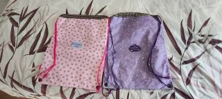 bolsos tipo mochila de la marca Gorjuss 7 euros cada una o las dos por 12 - Un bolso con diseño de niña y conejo sobre fondo rosa. - Otro bolso con diseño de niña bajo un cielo estrellado y luna. - Cierre de cordón ajustable.