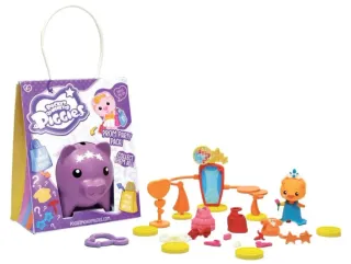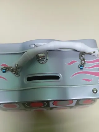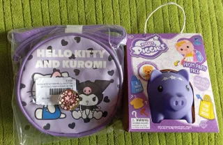 Conjunto de hucha y bolso con temática de Hello Kitty y Kuromi. - Hucha en forma de cerdito. - Bolso circular morado con personajes. - Incluye accesorios sorpresa para la hucha.