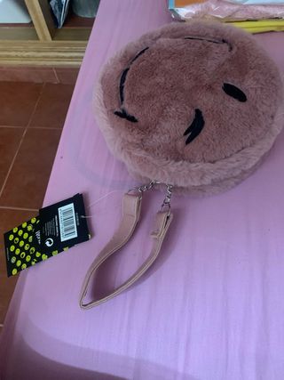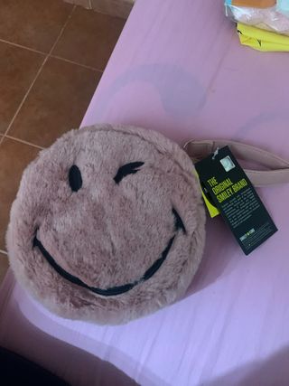 Bolso redondo de peluche con diseño de carita sonriente. - Material suave y agradable al tacto. - Cierre de cremallera. - Asa para llevar en la mano.