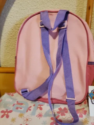 Conjunto de mochila pequeña y bolso para móvil. - Mochila con diseño de niña en bicicleta, unos 25 centímetros. Con cremallera y forrada por dentro. - Bolso para móvil con acabado brillante.