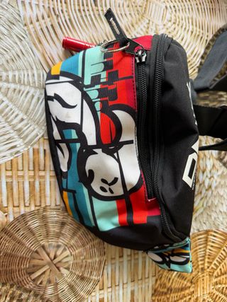 Riñonera con un diseño llamativo y colorido. - Estampado gráfico vibrante. - Cremallera principal. - Correa ajustable.