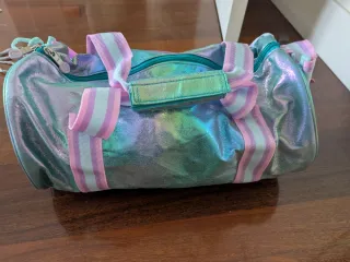Práctica bolsa de viaje con un diseño llamativo y moderno, perfecta para las escapadas de los más pequeños. - Material brillante con efecto iridiscente. - Correas de mano y detalles en rosa y azul claro. - Cierre de cremallera. - Asa de mano acolchada.