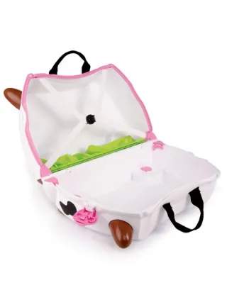 Maleta infantil con diseño de vaca, perfecta para que los más pequeños viajen cómodos y entretenidos. Solo usada una vez. Está Nueva. - Ruedas resistentes para facilitar el desplazamiento. - Asa para llevarla como equipaje de mano. - Divertido diseño de vaca con cuernos y manchas.