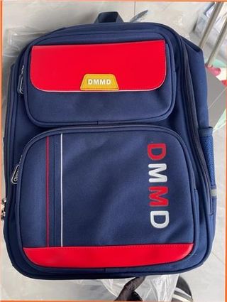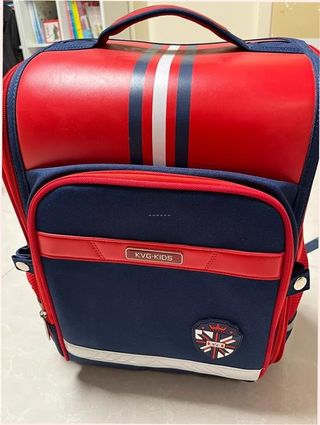 Mochila escolar de la marca KVG KIDS, ideal para niños. Presenta un diseño llamativo con detalles en rojo y azul. - Diseño con franjas rojas, blancas y azules en la parte superior. - Insignia con el logo de KVG KIDS en la parte frontal. - Escudo decorativo con diseño de Union Jack en la parte inferior.