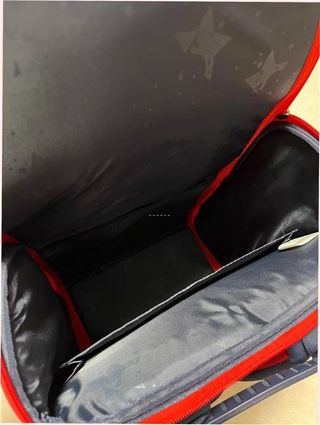 Mochila escolar de la marca KVG-KIDS, ideal para niños. Presenta un diseño llamativo con detalles en rojo y azul. - Compartimento principal espacioso. - Bolsillos laterales de malla. - Tirantes acolchados y ajustables. - Asa superior para colgar.
