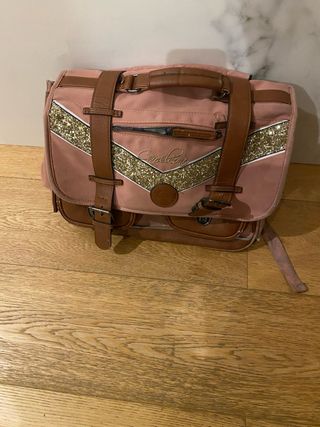Bonita cartera escolar para niña de la marca Carton. - Diseño con detalles en glitter dorado. - Cierre de solapa con correas. - Asa superior y correas ajustables.