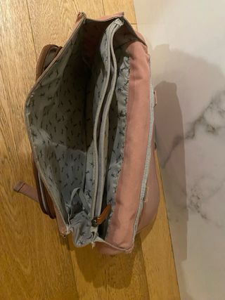 Mochila con un diseño único y encantador, inspirada en el estilo vintage y los viajes. - Estampado con motivos de sellos postales, maletas y una figura de niña. - Cierre de cremallera superior. - Correas ajustables para llevar como mochila. - Detalle de etiqueta con ilustración.