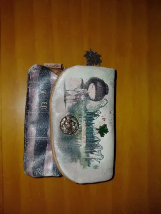 Monedero con un bonito estampado de una niña en un bosque. - Diseño con detalles de árboles y elementos naturales. - Cierre de solapa con botón. - Adorno metálico en forma de hoja.