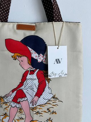 Bolso tote de estilo vintage, hecho a mano con un encantador diseño de una niña sentada en un lago. Nuevo con etiqueta. Medidas : 35 x 32 cm - Forro en el interior con un bolsillo con cremallera y otro bolsillo canguro en el exterior en la parte trasera.