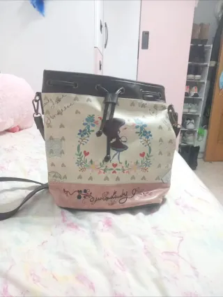 Bolso de hombro con un diseño encantador y juvenil. Sin marca. - Estampado principal con una figura de niña y flores. - Detalles de corazones y escritura decorativa. - Cierre de cordón ajustable. - Asa larga para llevar al hombro.