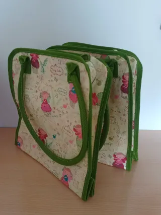 Conjunto de dos bolsas de loneta con un bonito estampado. - Diseño con niñas y cupcakes. - Ribete y asas en color verde. - Medidas 28 cm alto, 27 cm Sancho y 10 cm profundidad.