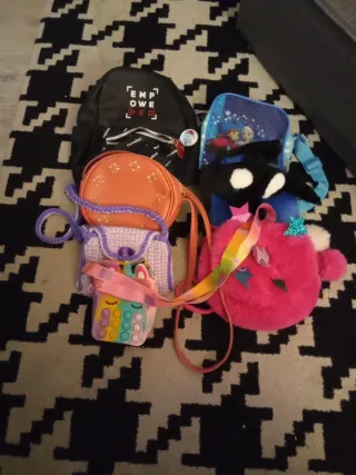 Lote de 7 bolsos variados para niñas. - Bolso negro con estampado Empower Red. - Bolso naranja con detalles brillantes. - Bolso morado tejido. - Bolso unicornio con pop it. - Bolso rosa redondo con detalles. - Bolso azul con personajes de Frozen. - Peluche orca.