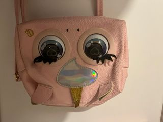 Bolso de diseño divertido para niñas. - Color rosa con detalles dorados. - Adorno de ojos grandes y brillantes. - Aplicación de cono de helado con acabado holográfico y purpurina.