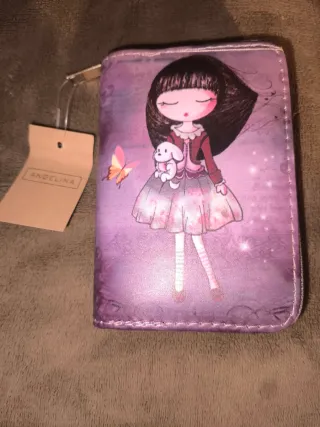 Cartera con un diseño encantador de una niña con su muñeco y una mariposa. - Ilustración detallada en tonos morados y rosas. - Cierre de cremallera.