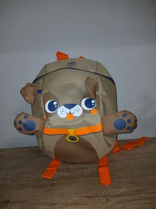 Mochila infantil con diseño de perro. - Color principal marrón con detalles naranjas. - Orejas y patas de peluche. - Correa ajustable. Como nueva. Mide 30X25 cm.