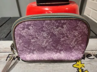 Neceser con un bonito estampado de una niña y ciervos en un bosque. - Diseño con detalles de árboles y pájaros. - Cierre de cremallera. - Incluye una pequeña correa. - Estampado en tonos rosas y marrones.