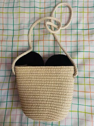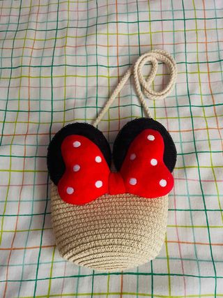 Bolso infantil con diseño de Minnie Mouse. - Orejas negras. - Lazo rojo con lunares blancos. - Tejido de rafia. - Correa de cuerda. -trae cierre. PRECIO NEGOCIABLE