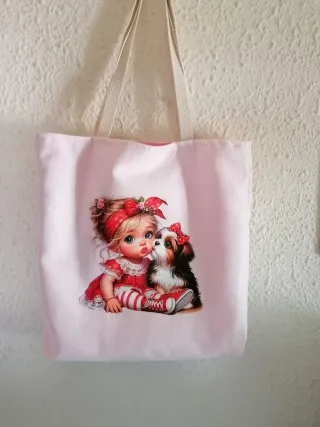 Precioso bolso tote de tela, ideal para llevar tus cosas con estilo. Es una pieza única hecha a mano. -forada por dentro con un bolsillo - -en la parte de detrás dos bolsillos - Diseño con niña y perrito. - Cintas de algodón para llevar al hombro. -las medidas en las fotos Más cosas hechas a mano en mi perfil muy bonitas