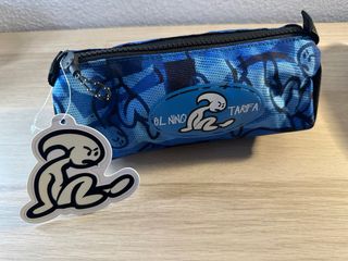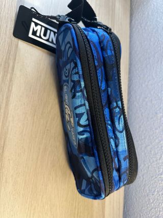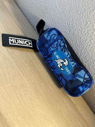 Estuche de la marca Munich con un diseño llamativo. - Estampado de camuflaje en tonos azules y negros. - Detalle de parche con logo y texto EL NIÑO TARifa.
