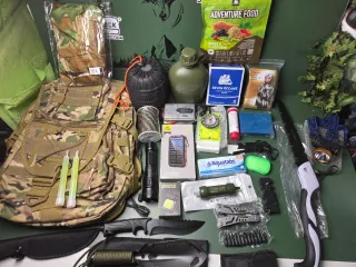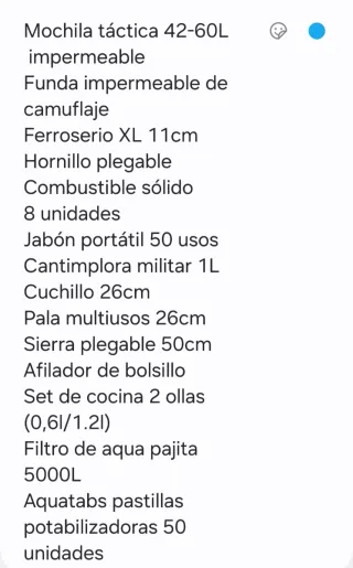 Kit de supervivencia completo con mochila táctica expandible. - productos nuevos - Mochila táctica de 42 a 60 litros. Impermeable - Incluye varios accesorios de supervivencia como linterna, navaja, brújula, filtro de agua, manta térmica, y más. - Ideal para actividades al aire libre, camping o emergencias.