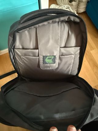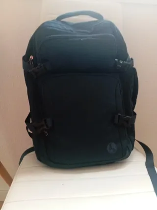 Mochila negra, ideal para viajes y para llevar tu ordenador portátil. - Diseño moderno y funcional. - Compartimento principal espacioso. - Bolsillo frontal con cremallera. - Correas de hombro ajustables.tiene muchos compartimentos solo está mal la cremallera del exterior de ahí el precio por lo demás nueva