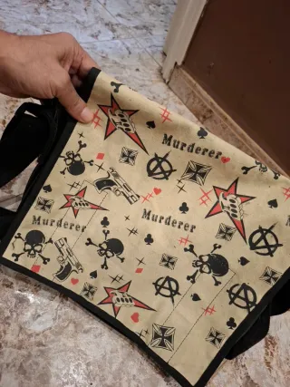 Maletín bolsa para ordenador portátil libros..con un diseño llamativo y estampado de calaveras, pistolas y símbolos punk rock anarchy - Estampado Murderer con elementos gráficos. - Ideal para llevar libros, ordenador portátil o como bolso de diario. - Cierre con correa. - Material resistente.