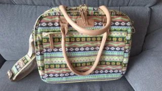 Maletín de la marca KAYOND con un diseño vibrante y original. - Estampado geométrico y floral en tonos beige y multicolor. - Asas de mano y correa ajustable para llevar al hombro. - Compartimentos exteriores e interiores con cremallera. - Fondo/base acolchado y reforzado para proteger el ordenador. - Compartimentos interiores para guardar cosas.