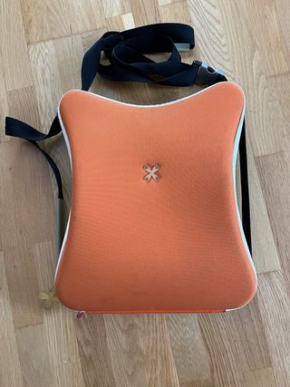 Mochila o bolsa con un diseño moderno, ideal para transportar tu ordenador portátil. - Color naranja vibrante con ribete blanco. - Asa negra ajustable. - Detalle central en forma de 'X' metálica. Sólo envíos por correo