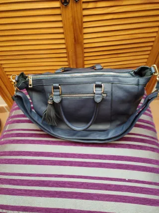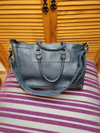 Bolso grande de color azul, perfecto para llevar tu ordenador portátil y otros objetos. - Amplio compartimento principal. - Cierre de cremallera. - Asas de mano y correa para hombro.
