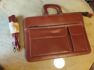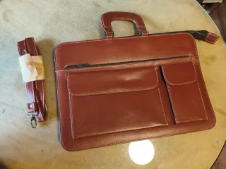 Maletín de cuero para ordenador portátil. Muy útil para documentos, carpetas, etc. Cinta para llevar colgado. Un accesorio elegante y funcional para llevar tus dispositivos. - Material: Cuero - Color: Marrón - Incluye correa ajustable para el hombro. - Ancho: 43 cm - Alto: 30 cm