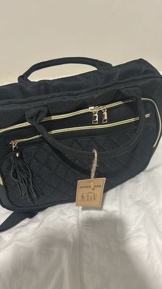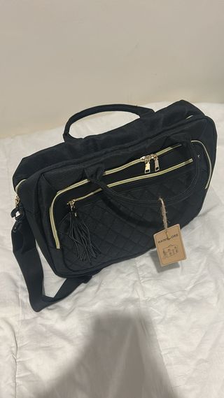 Maleta de diseño acolchado con detalles dorados. - Compartimento principal espacioso. - Bolsillo frontal con cremallera. - Asa de mano y correa para hombro. - Adorno de flecos en cremallera. Maleta/bolsa para ordenador de color negro , medidas 44 cm x 33 cm. De la marca Rainsmore. Con etiqueta.