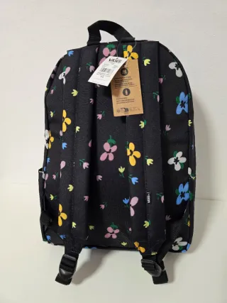 Mochila con un estampado floral sobre fondo negro. Nueva a estrenar, con etiquetas. Bolsillo principal de gran capacidad, con compartimento para ordenador o libros. Capacidad de 22 litros. Bolsillo exterior con monedero.