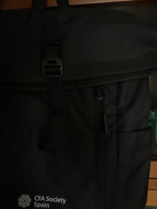Mochila negra con el logo de CFA Society Spain. - Cierre superior enrollable. - Bolsillo frontal con cremallera. - Bolsillos laterales.