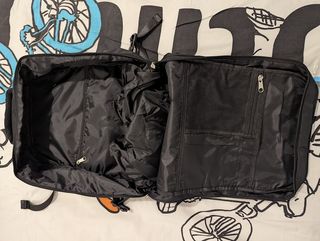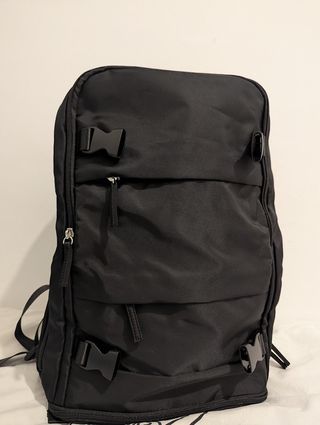 Mochila de viaje con las medidas de ryanair, vueling, easyjet y demás compañías lowcost. Buenos materiales, resistente y con varios compartimentos: zapatos, ordenador, bolsillos exteriores e interiores... Incluye una bomba de vacío que no necesita cables y una bolsa de vacío compatible. La vendo sin estrenar porque compré de más para regalar pero no me hizo falta al final. Cabe mucha ropa y te ahorras los 50€ de multa por pasarte de las dimensiones del equipaje.