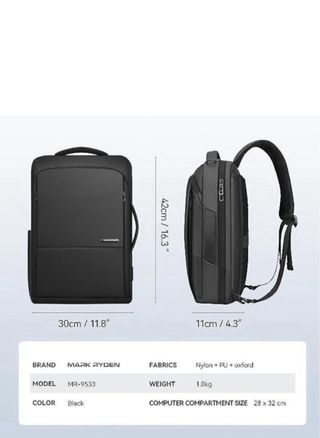 Mochila de la marca Mark Ryden en color negro, modelo MR-9533. Diseñada para llevar tus pertenencias de forma organizada y segura. - Materiales: Nylon + PU + oxford. - Peso: 1.0kg. - Dimensiones: 30cm (ancho) x 42cm (alto) x 11cm (profundidad). - Compartimento para ordenador portátil: 28 x 32 cm. Presenta algunos signos de desgaste en el asa, por lo demas bien.