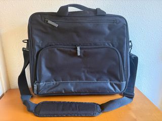 Maletín para portátil Dell en color negro. Cuenta con asa de mano y correa ajustable para el hombro. - Compartimento principal acolchado. - Bolsillos exteriores con cremallera. - Asa de mano con agarre acolchado. - Correa de hombro ajustable y extraíble. Nunca ha sido usada pero tiene un deterioro estético en la parte que es de polipiel debido al paso del tiempo. Medidas: 44 cm de ancho 34 cm de alto 11 cm de fondo