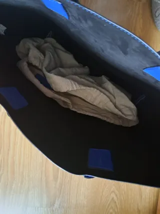 Bolso grande color azul Klein. Con bolsa interior. Cabe un ordenador portátil. Con un poco de desgaste en las asas y las esquinas. Medidas: 45cm ancho 32cm alto (sin asas) 12cm profundidad