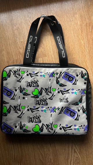 Bolso de mano con un llamativo diseño gráfico. - Asas negras con logo. - Estampado frontal con corazón, estrellas y notas musicales. - Ribetes negros. Bolso de marca custo para ordenador muy buen estado. Puedes ver más artículos en mi perfil 😜