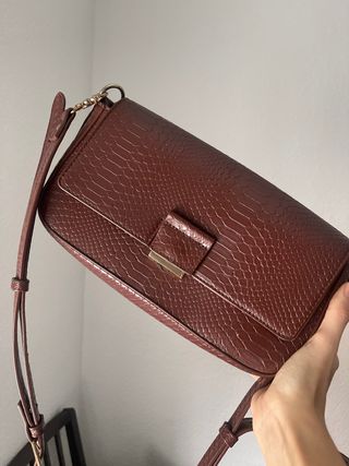 Un bolso de mano marrón que te vale para todo. Para cuando quieres ir más informal o más arreglada. Me lo he puesto un porrón de veces para todo tipo de ocasiones, sobre todo, para cenar con mi pareja y por eso me trae buenos recuerdos. Está un poco desgastada la cadena pero no se ve e, incluso, a lo mejor lo puedas quitar. Si te mola el rollo piel de serpiente, el acabo es de esre estilo y se cierra con solapa y detalle metálico. La correa la puedes ajustar y también quitarla por si te apetece llevarlo como bolso de mano.