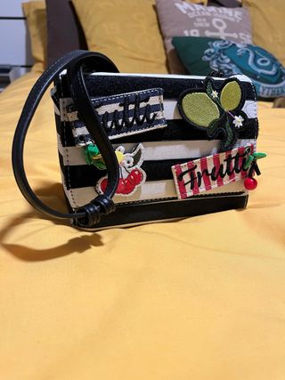 Bolso pequeño con diseño de rayas blancas y negras. Presenta varios parches decorativos. - Diseño de rayas verticales y horizontales. - Parches temáticos de frutas y texto. - Correa ajustable para llevar al hombro.