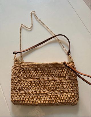 Bolso de rafia con detalles dorados y asas de piel. - Material: Rafia - Color: Beige y dorado - Asas: Piel - Con cadena para llevarlo mas largo, tambien se puede quitar todo y quedarse como bolso de mano