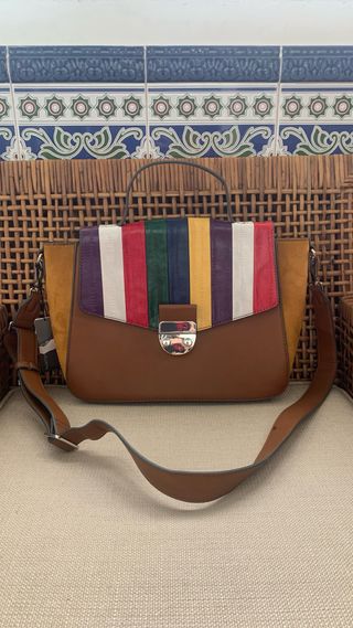 Bolso de mano y bandolera con un diseño único y llamativo de Parfois. Sin estrenar, con etiqueta. - Estilo vintage. - Combinación de colores marrón y multicolor. - Cierre metálico. - Asa de mano y correa ajustable para bandolera. - Cremallera interior. - Bolsillo interior y en la parte de detrás. - Material poliuretano y poliéster, laterales efecto ante.