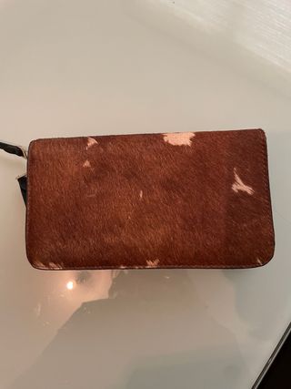 Elegante cartera con acabado de pelo. - Material exterior: pelo de animal. - Tonos: beige y marrón.