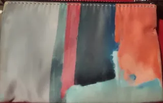Monedero con cierre de cremallera. - Diseño abstracto con bloques de color. - Tonos que incluyen naranja, azul y rosa.